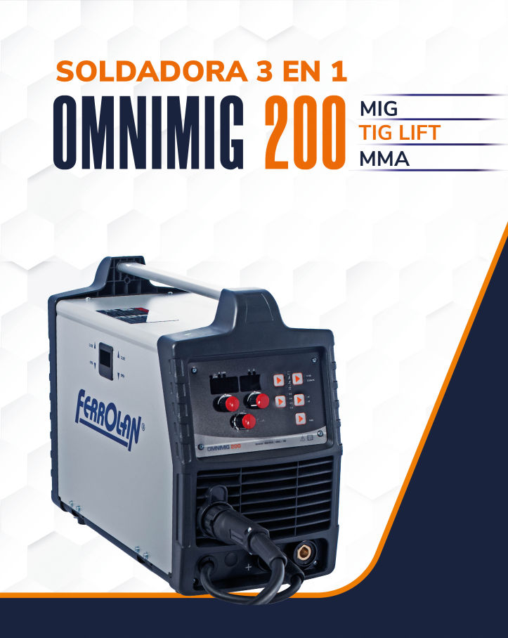 Equipo inverter MIG MAG 3 en 1 de 200amp. Sinérgico y portable con tren de tracción metálico y regulación de inductancia.
