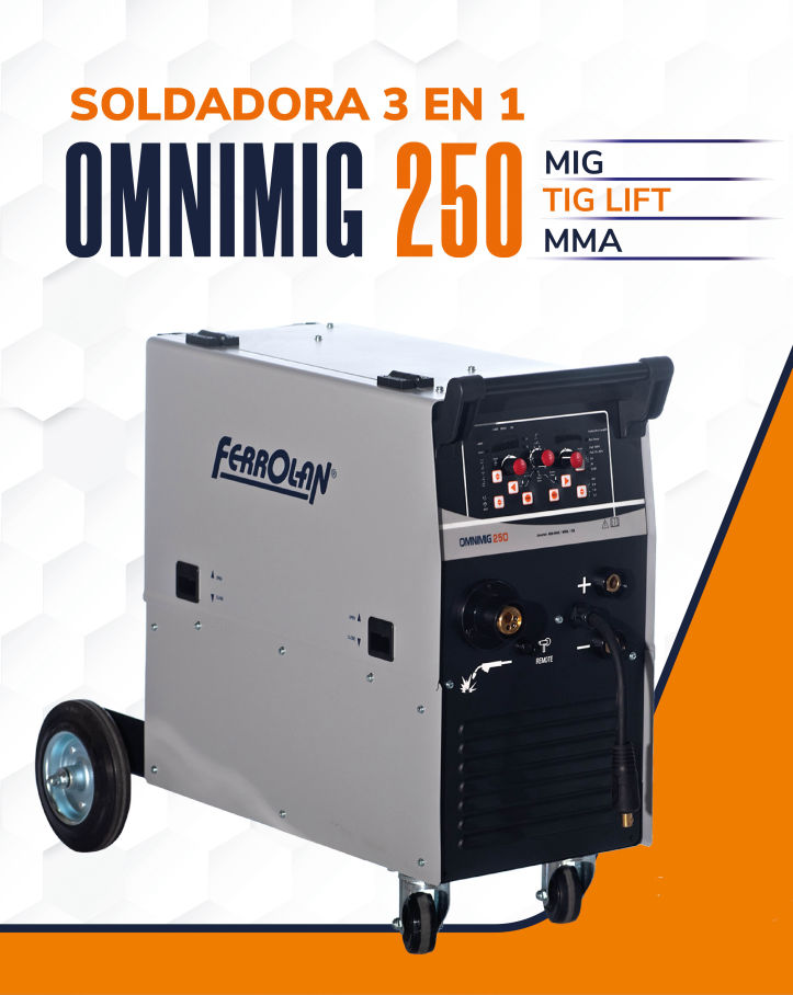 Equipo inverter MIG MAG 3 en 1 de 250amp. Sinérgico y portable con tren de tracción metálico y regulación de inductancia
